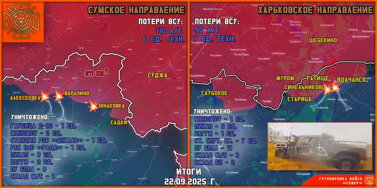 Российские войска развивают наступление на нескольких направлениях фронта. 23 сентября зафиксированы продвижения в районе Константиновки — подразделения ВС РФ вошли в посёлки Плещеевка и Ягодка. Закрепление в Ягодке фактически означает начало боёв за сам город.