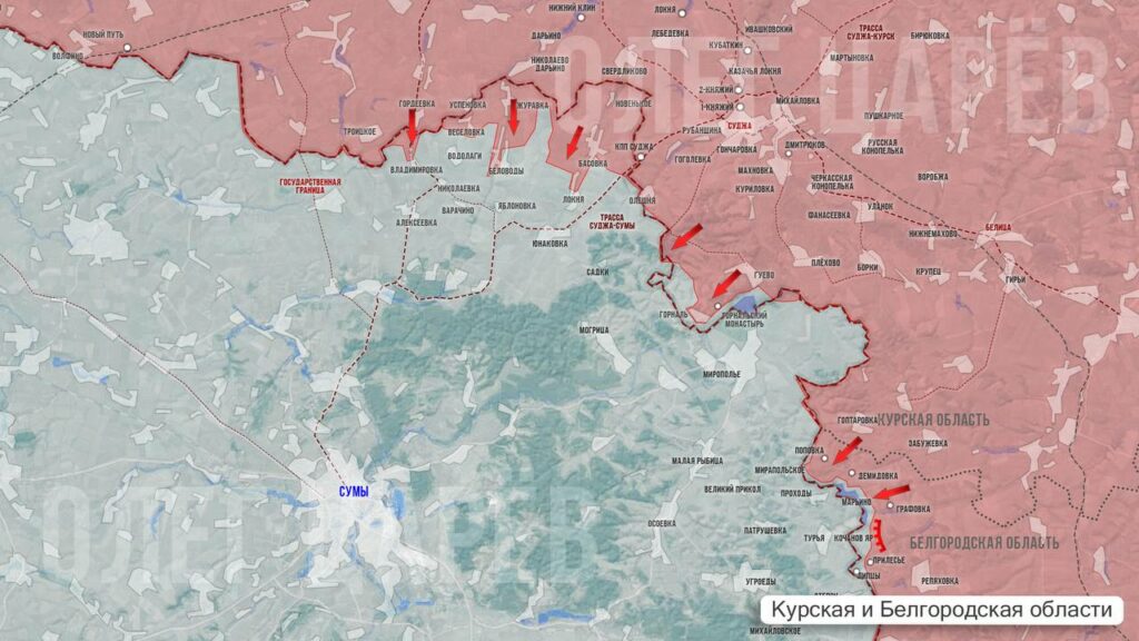 На российской стороне границы ещё отмечается присутствие разрозненных малочисленных групп ВСУшников в лесополосах Краснояружского района Белгородчины и в лесных урочищах и оврагах у Гуево и Олешни Курской области.