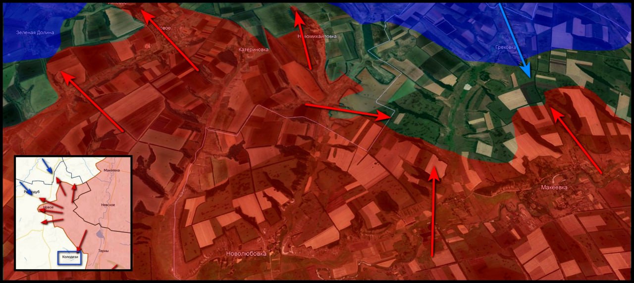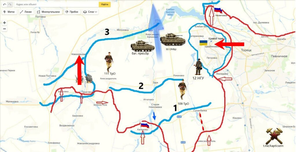Западнее Торецка ВС РФ разворачивают наступление к северу от Тарасовки. Штурмовики пробиваются в сторону Новой Полтавки, вдоль правого берега реки Бычок движутся к Новоленовке, а также возобновили движение к Александрополю. Немного ниже по карте ВС РФ начали выравнивать фланг, двигаясь со стороны Новоалександровки к Калиново и Старой Николаевке. Севернее Сухой Балки наши войска пробиваются в сторону Романовки. К северу от Торецка ВС РФ продолжают атаки в районе Дылеевки.