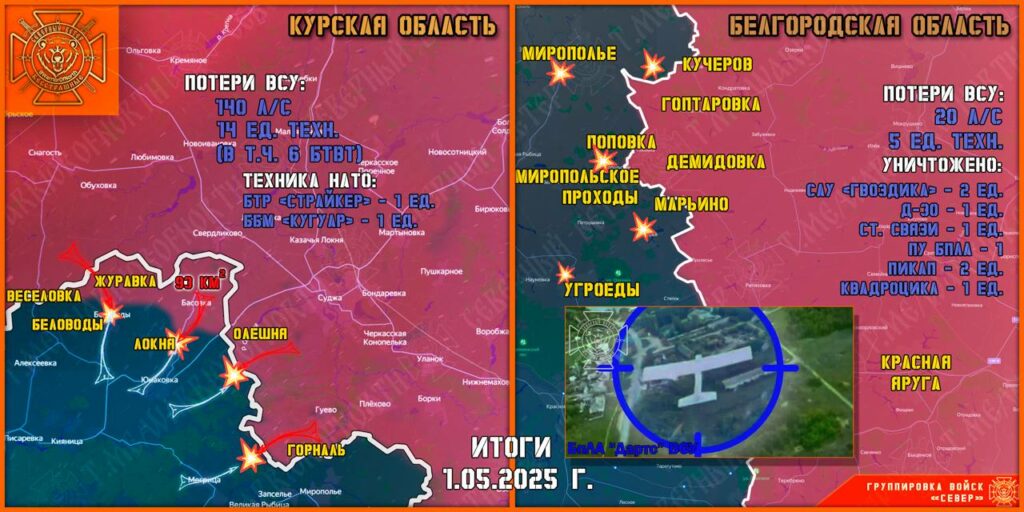 В Краснояружском районе Белгородской области наши военные контролируют маршруты возможных перемещений ВСУ, наносят удары на территории Сумской области. Так, была уничтожена украинская ДРГ в Краснопольском районе, двигавшаяся в направлении курской Гоптаровки, нанесён удар по скоплению сил противника в Угроедах.