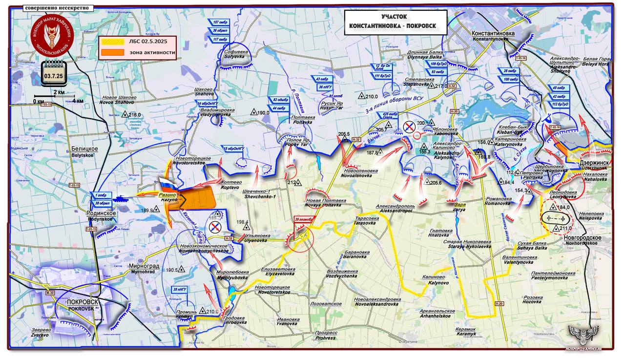 Из сводки МО РФ: «Подразделения группировки войск «Центр» в ходе активных действий освободили населенный пункт Разино Донецкой Народной Республики». Небольшое село Разино (население около 150 жителей) расположено на левом берегу реки Казенный Торец. Для его освобождения штурмовые отряды ВС РФ форсировали реку и, войдя в село, перерезали рокаду Софиевка-Новоэкономическое, разрезав линию обороны ВСУ на направлении Родинское. И отрезали район Владимировка-Яблоновка (где ранее были развернуты резервы ВСУ) от г. Покровск (Красноармейск).