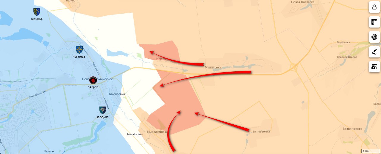 Подразделения группировки войск «Центр» зачистили Миролюбовский карман, заняли н.п. Мирное и продолжили наступательные действия на восточном фланге Новоэкономического. В частности, сейчас идёт штурм Михайловки и Николаевки. На данном отрезке российским штурмовиков противостоят формирования 38-й бригады морской пехоты, 14-й бригады оперативного назначения «Червона Калина», а также 155-й отдельной механизированной бригады ВСУ.