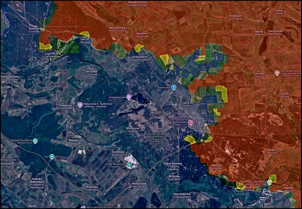 В самом Лимане идут столкновения у городской больницы и на трассе Лиман — Заречное. Отмечаются зацепы за лесхоз в микрорайоне Лесной и район дома престарелых, что указывает на попытку обхода плотной застройки через лес.