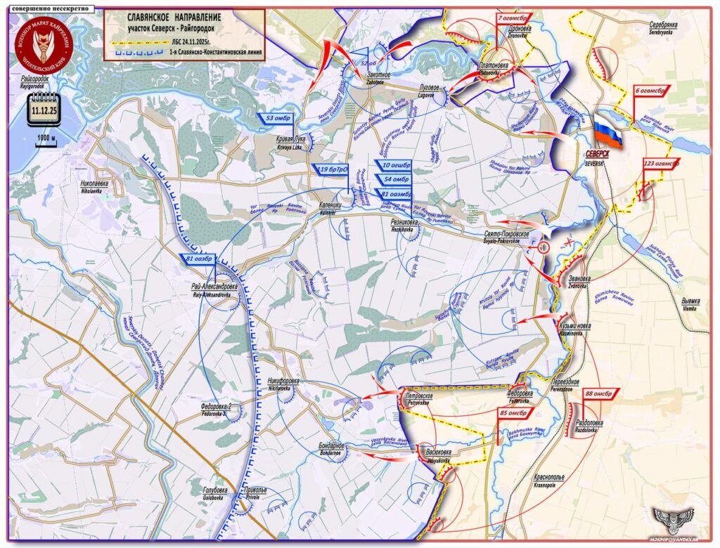 Северск перешёл под контроль подразделений ВС РФ. Украинские формирования, не удержав городскую застройку и ключевые узлы, начали организованный отход на западные высоты, пытаясь выстроить новую линию обороны на доминирующем рельефе. В самом городе ведутся мероприятия по закреплению, зачистке и стабилизации обстановки.