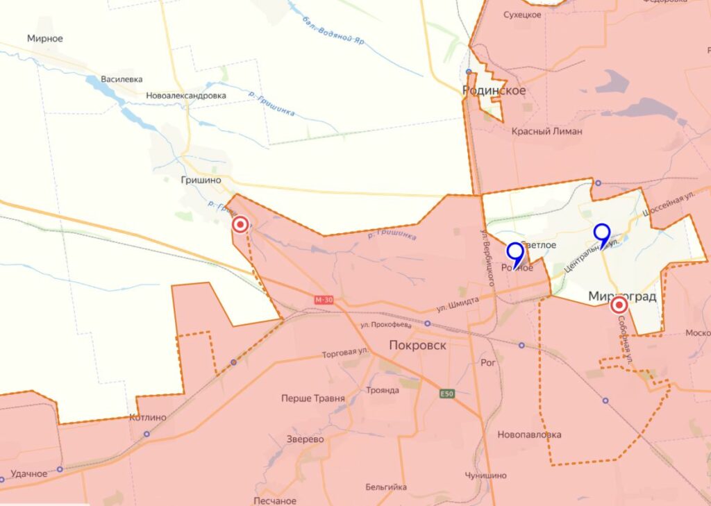 После зачистки Покровска наши войска методично выбивают противника из Мирнограда. ВСУ уже не пытаются прорваться на помощь, только дронами подбрасывают боеприпасы. Гарнизон слабо держится и при первой возможности сбегает. Севернее Покровска ВСУ малыми группами (2–5 чел.) стягиваются в ангары и опорники на рубеже Родинское – север Покровска, пытаясь удержаться и контратаковать у Родинского. На участке Белицкое – Новое Шахово – Шахово без изменений: обе стороны «выживают» под плотным дроновым огнём и ждут туманов для манёвра, — Архангел Спецназа.