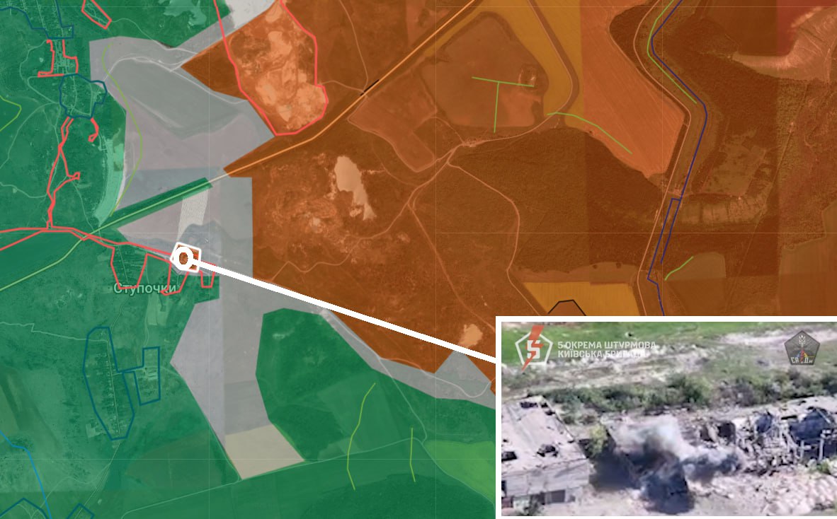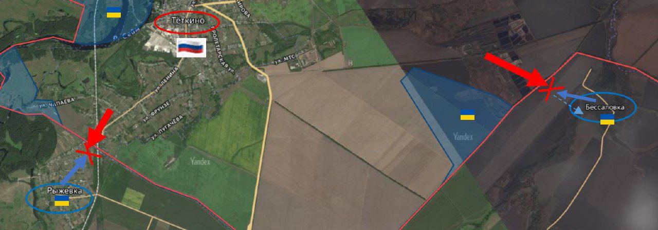 Продвижение видно в направлении Новооленовка-Яблоновка. Передовые группы наших подразделений закрепляются на окраинах Яблоновки и выставляют боковое охранение вдоль реки Бычек. Продолжается давление на н.п. Попов Яр, куда в конце мая вышли резервы ВСУ в районе севернее Шевченко Первое, вязкие бои с противником, засевшим в отсечных позициях и прикрывающим развертывание резервов ВСУ.