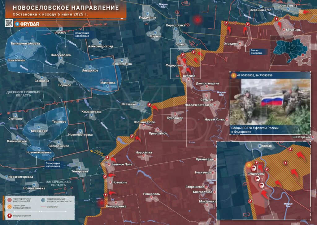 Западнее Новомихайловки продолжаются тяжёлые бои за опорные пункты врага в районе населённого пункта Новый Мир. Российские штурмовые группы ведут наступление, стремясь прорвать оборону противника. Украинские войска оказывают сопротивление, используя укреплённые позиции и минные поля.