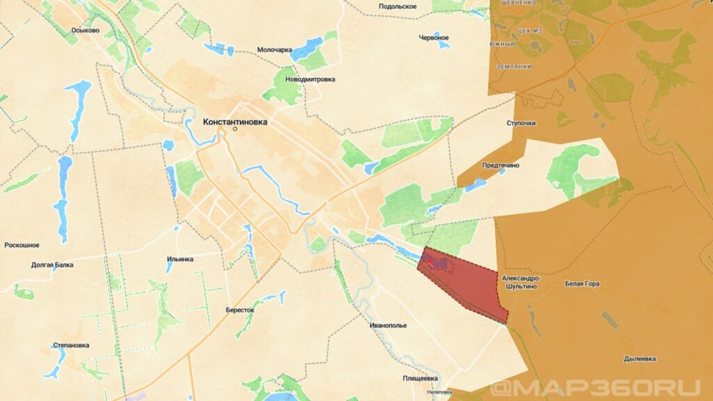 На западном участке Константиновского фронта от Кучеров Яра ВС РФ продвигаются к окраине Грузского. Восстановлен контроль над позициями северо-западнее Шахово в районе карьера и леса, где до этого ВСУ контратаковали. Есть успехи наших войск возле Владимировки. Противник контратакует у Русина Яра и Полтавки. В районе Клебан-Быкского водохранилища, несмотря на плотную работу БПЛА ВСУ, наши наступают по линии Александро-Шультино — Предтечино, а также атакуют в пригородных Константиновских дачах, стараясь зайти в город с востока.