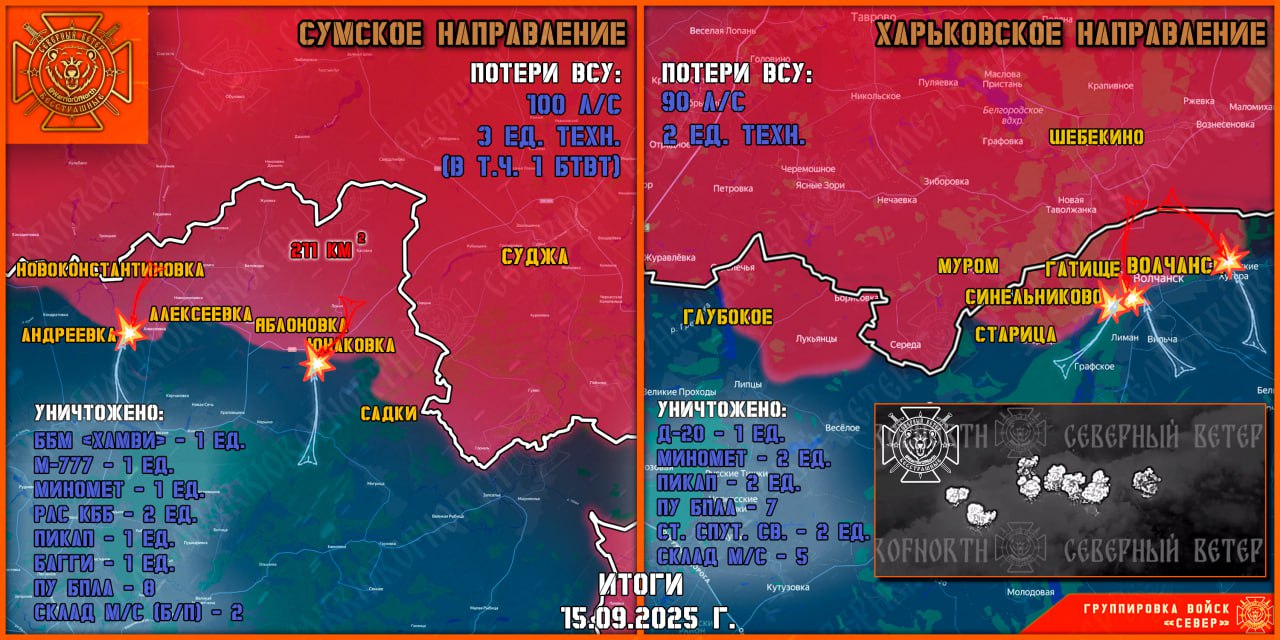 ВСУ, несмотря на наличие большого количества сил и средств на данном участке, с потерями отступают под натиском Северян. Кроме того, этому способствует интенсивная и грамотная работа артиллерии, расчетов ТОС группировки «Север», а также авиации ВКС РФ. На Липцовском участке фронта без существенных изменений. ВСУ активных действий не предпринимали, — Северный Ветер.