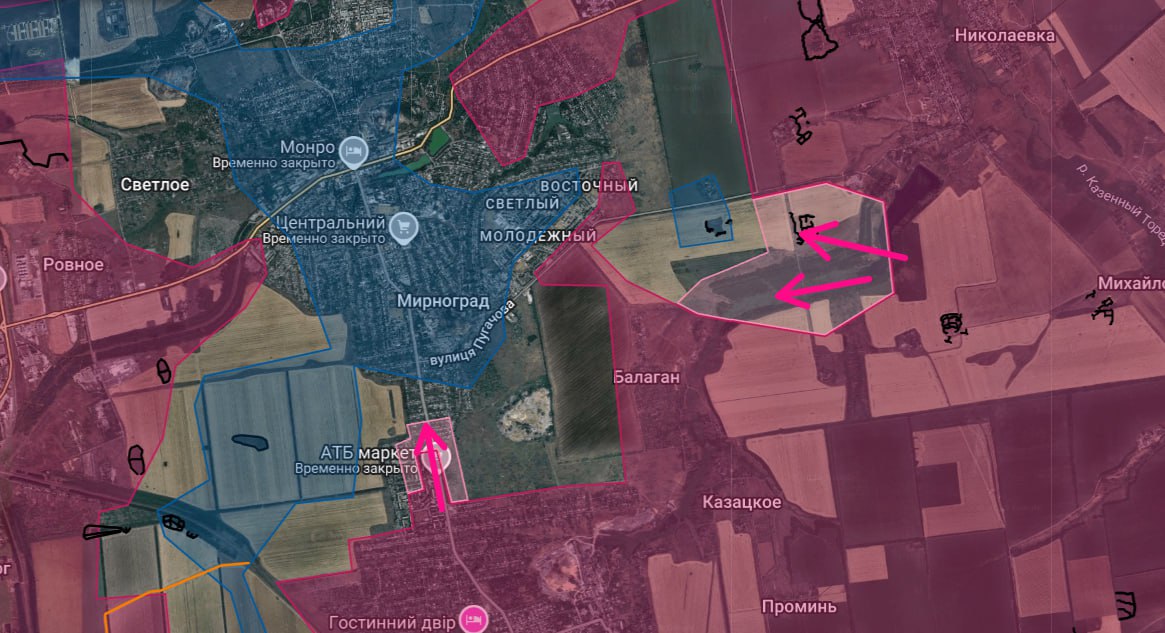Отход украинских подразделений возможен только с боем, пишет украинский военный эксперт Машовец. В Мирнограде российские войска заняли юго-восточную часть города до улицы Сретенской и одновременно вклинились в северные кварталы, продвигаясь от Новоэкономического. Также ВС РФ вышли к Т-образному перекрестку южнее Родинского и закрепляются там.