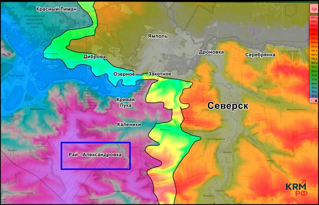 Отдельное значение имеет участок южнее Рай -Александровки, где проходит трасса М-03 на Славянск. Контроль над этим узлом фактически нивелирует угрозу со стороны самого Славянска, который расположен в низине, как и населенные пункты Диброва, Озерное, Старый Караван, Брусовка, Щурово. Райгородок в текущей конфигурации также не представляет оперативной опасности. Закрепление в этих населенных пунктах — скорее элемент охвата и выдавливания, а не ключевая цель.