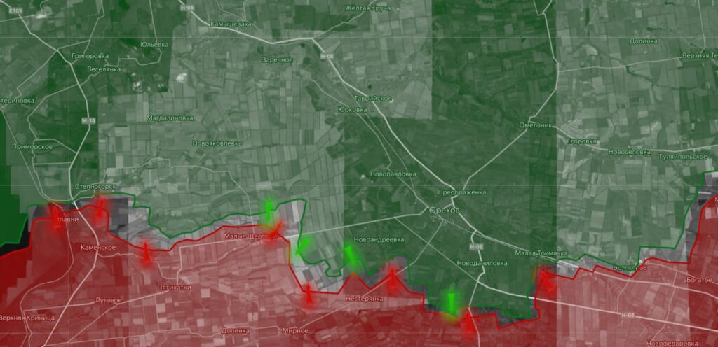 Подразделения группировки Днепр: На Ореховском направлении, в районе Новоданиловки и Малой Токмачки идут интенсивные бои, линия боевого соприкосновения без изменений. Подразделения 58 армии ВС РФ продолжили продвижение в направлении дороги, соединяющей Орехов и Запорожье.