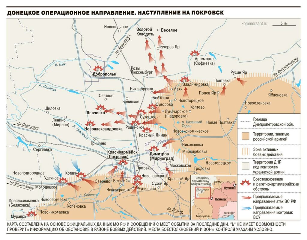 На Покровском фронте, по оперативным данным, ВС РФ закрепились юго-западнее ж/д станции в Удачном. Стараются усилить позиции наши бойцы в районе Котлино, это особенно важно на фоне сообщений о продвижении со стороны Родинского к Гришино с севера. Поступают единичные сообщения о полном контроле над Леонтовичами, а также об установлении нашими огневого контроля над трассой Покровск-Павлоград, но нужно дождаться подтверждения. МО РФ подтвердило освобождение Суворово и Никаноровки, это означает укрепление линии прорыва и усиление наших позиций восточнее Белицкого. Ресурсы противника сообщают об освобождении нашими Золотого Колодезя, но эта информация пока не подтверждена. Различные источники с обеих сторон сообщают о боях у Маяка, и Кучерова Яра. В Родинском тяжёлые бои, инициатива на стороне ВС РФ. Украинские военные утверждают, что только на Покровском сосредоточено 110 тысяч личного состава ВС РФ. Украинские спикеры говорят о том, что причиной прорыва ВС РФ стала «слабая коммуникация между подразделениями, неэффективное применение войск, ложь на всех уровнях, отсутствие адекватных решений».