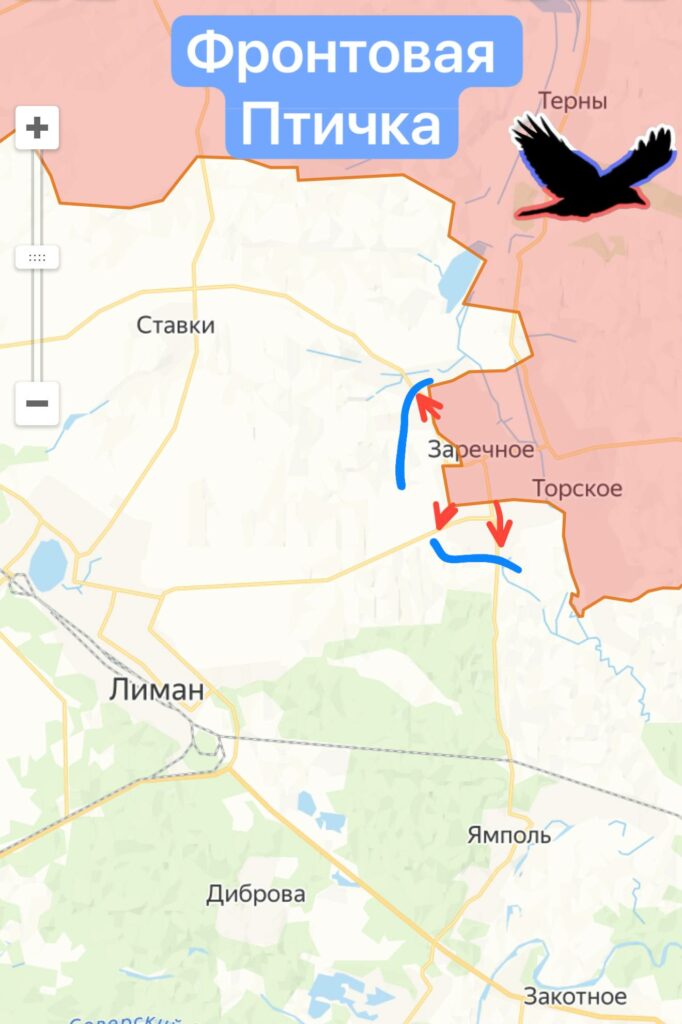 От н.п. Заречное и Торское по направлению к Лиману планомерно развивают наступления наши штурмовики. Им помогает артиллерия и минометы. За сутки подбили 2 вражеских БТР и 1 танк Т-64 всу.
