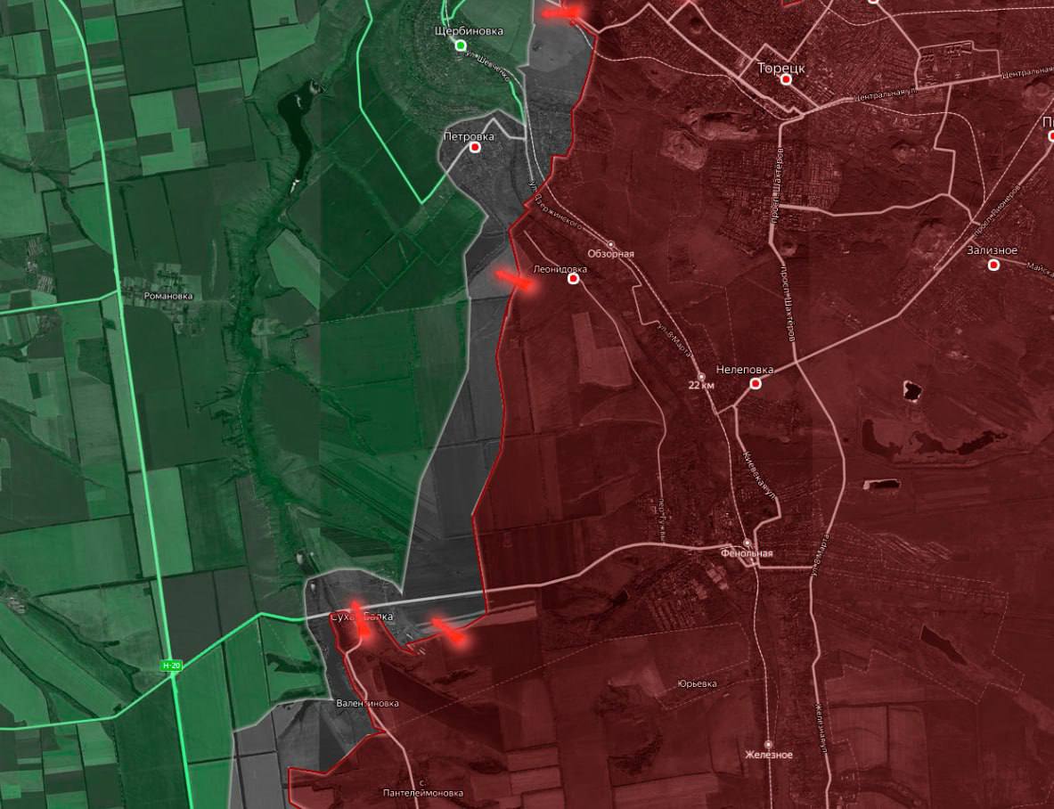На восточном фланге Торецкого направления во время перемирия противник пытался контратаковать в районе Сухой Балки, атака была отбита. ВС РФ усилили натиск в этом селе, и выбили врага из ряда опорников западнее Нелеповки и Леонидовки. Это означает, что у ВС РФ здесь будет обеспечен тыл и можно организовать наступление на Щербиновку. К северу от Торецка наши части теснят противника к посёлку Дылеевка.