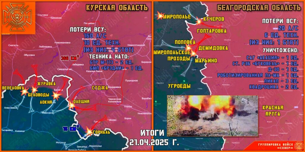 На Покровском фронте противник сообщает о высокой активности ВС РФ после окончания перемирия. В Зверево наши стараются выдавить противника из села. Тяжелые бои на участке между Котлино и Покровском. Противник признал потерю Преображенки, о чём МО РФ заявило еще 17апреля. В Успеновке вновь бои, ВС РФ стараются выбить ВСУ обратно за пределы села. Идут упорные штурмы позиций противника в Котляровке и на окраинах Орехового. На восточном фланге идёт сражение за Миролюбовку, сообщают, что ее большая часть под нашим контролем. Практически повсеместно отмечается огромное число дронов противника.