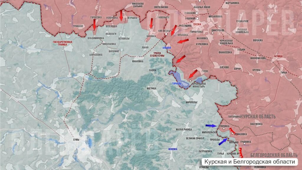 Сегодня с раннего утра ВСУ попытались пересечь государственную границу как раз на стыке Курской и Белгородской областей в направлении Поповки. ВС РФ дали отпор, в стрелковом бою большая часть штурмовиков была убита, отступающих добили ударами артиллерии и сбросами с дронов. Сразу после этого, как сообщают с фронта, наша артиллерия нанесла серию точечных ударов по скоплениям сил ВСУ в сумском приграничье.