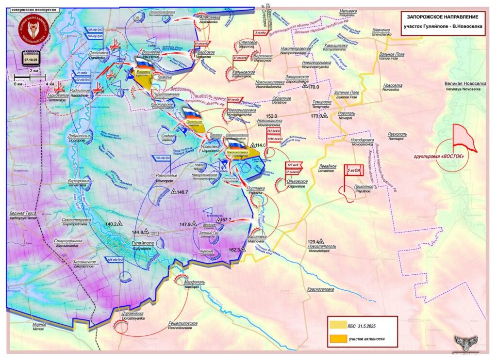 За прошедшие сутки Армия России продолжила наступательные действия на рубеже Работино-Вербовое. Бойцы 1430 гвардейского полка 58-й гвардейской общевойсковой армии нанесли поражение силам ВСУ южнее Новоданиловки. Подразделения группировки Днепр: На Ореховском направлении, в районе Новоданиловки и Малой Токмачки идут позиционные бои, линия боевого соприкосновения без изменений.