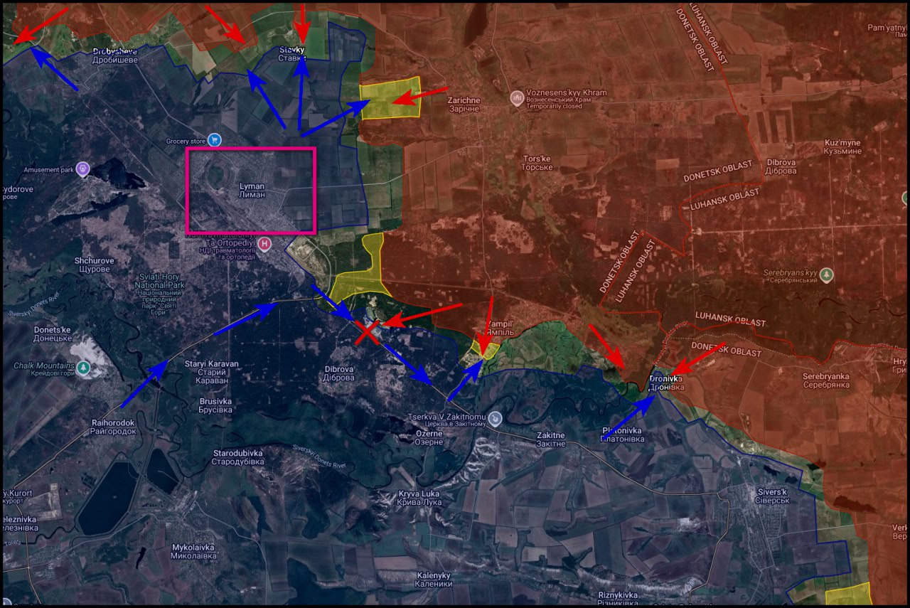 На Краснолиманском направлении идут интенсивные бои в районе Новосёловки и Дробышево. ВС РФ расширяют подконтрольную территорию в лесах южнее Новосёловки и удерживают под контролем часть ж/д между Яровой и Дробышево. ВС РФ, продвигаясь западнее Ямполя на Диброву, перерезали дорогу между Красным Лиманом и Ямполем. В Масляковке продолжаются бои за село.