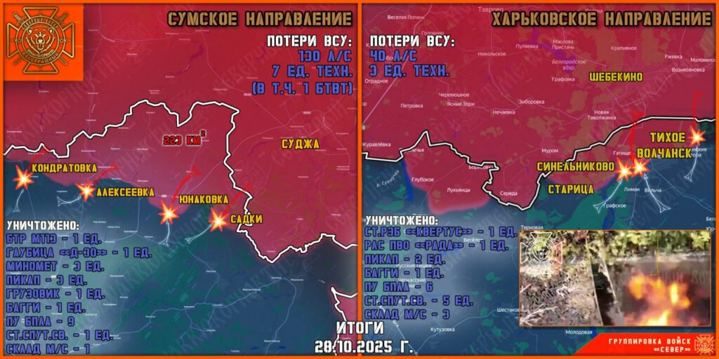 На участке фронта Меловое-Хатнее наши штурмовики продвинулись на 750 м по лесопосадкам. Артиллерия и расчеты ТОС-1А «Солнцепек» Северян продолжали наносить удары по позициям 3 отмбр ВСУ в районе Двуречанского. На Липцовском участке фронта без существенных изменений. Расчеты FPV 11 АК наносили удары по радиоэлектронному оборудованию противника в Липцах, — Северный Ветер.