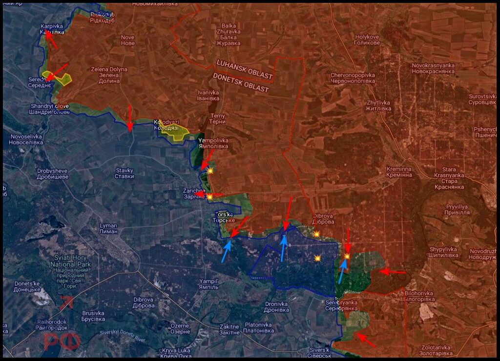 В Кременском лесу продвижение идёт постепенно: позиции противника подавляются огнём, затем штурмовые группы проводят зачистку. Основной манёвр направлен на отрезание северного фланга Северского направления, создавая давление с лесных участков и высот. Юго-западнее Червоной Дибровы и южнее Торского противник удерживает позиции, получает подкрепления и пытается контратаковать.