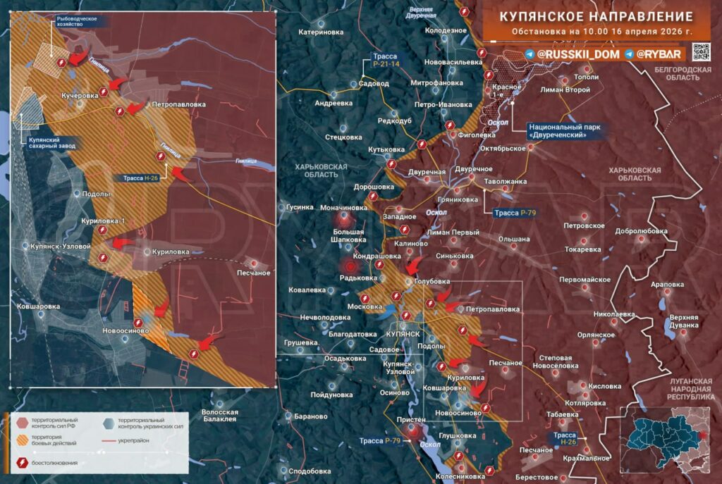 ВСУ перебросили часть резервов с Купянского направления на Бурлукское — там у них начались серьёзные проблемы после успехов российских войск под Волчанском. К вечеру 16 апреля 2026 года на фронте продолжаются упорные бои: наши полностью освободили Каленики на Северском направлении, давят на Купянском и Запорожском участках, а на Днепропетровщине расширяют плацдарм за рекой Волчьей.