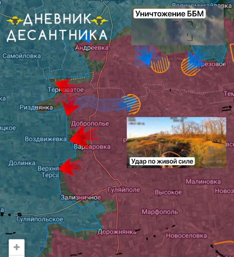 Западнее, на границе Запорожской и Днепропетровской областей, наши подразделения атакуют противника в населённых пунктах Новое Поле, Зоревка, Зарница, — Военкор Котенок.