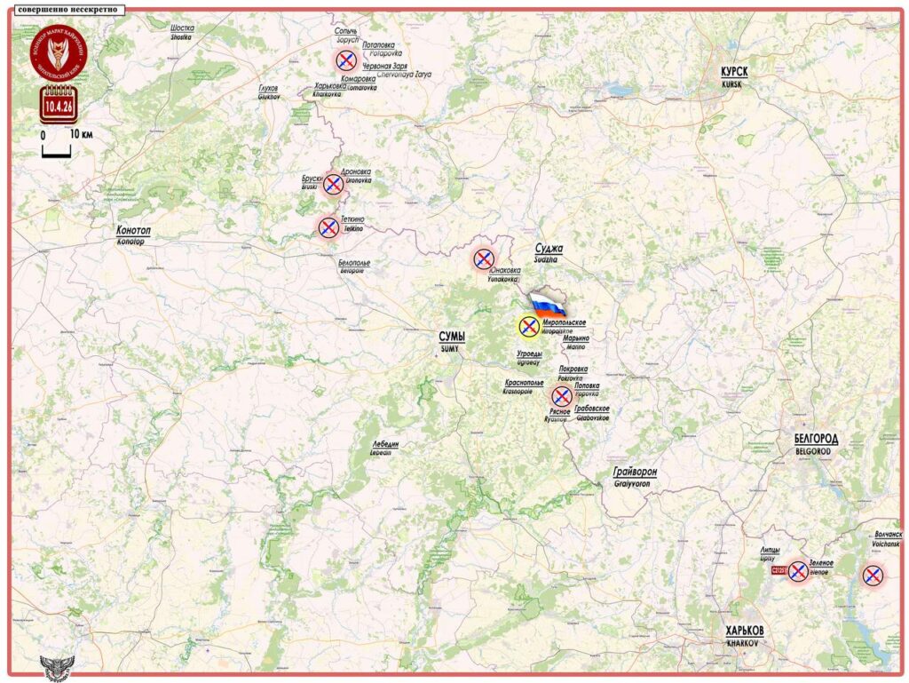 Для расширения буферной зоны и уничтожения обороны ВСУ на этом участке командование группировки «Север» проводит широкие фланговые обходы этого участка. 31 марта был освобожден н.п. Малая Корчаковка с угрозой левому флангу противника. 10 апреля силами 15 танкового полка 69 гвардейской мотострелковой дивизии взят под контроль н.п. Миропольское ( 50°56′32″ с. ш. 35°18′54″ в. д. — население 158 чел. в 2001 г.), который входил в систему флангового района обороны ВСУ, защищающего линию обороны Мирополье- Осоевка, — Военкор Марат Хайруллин.
