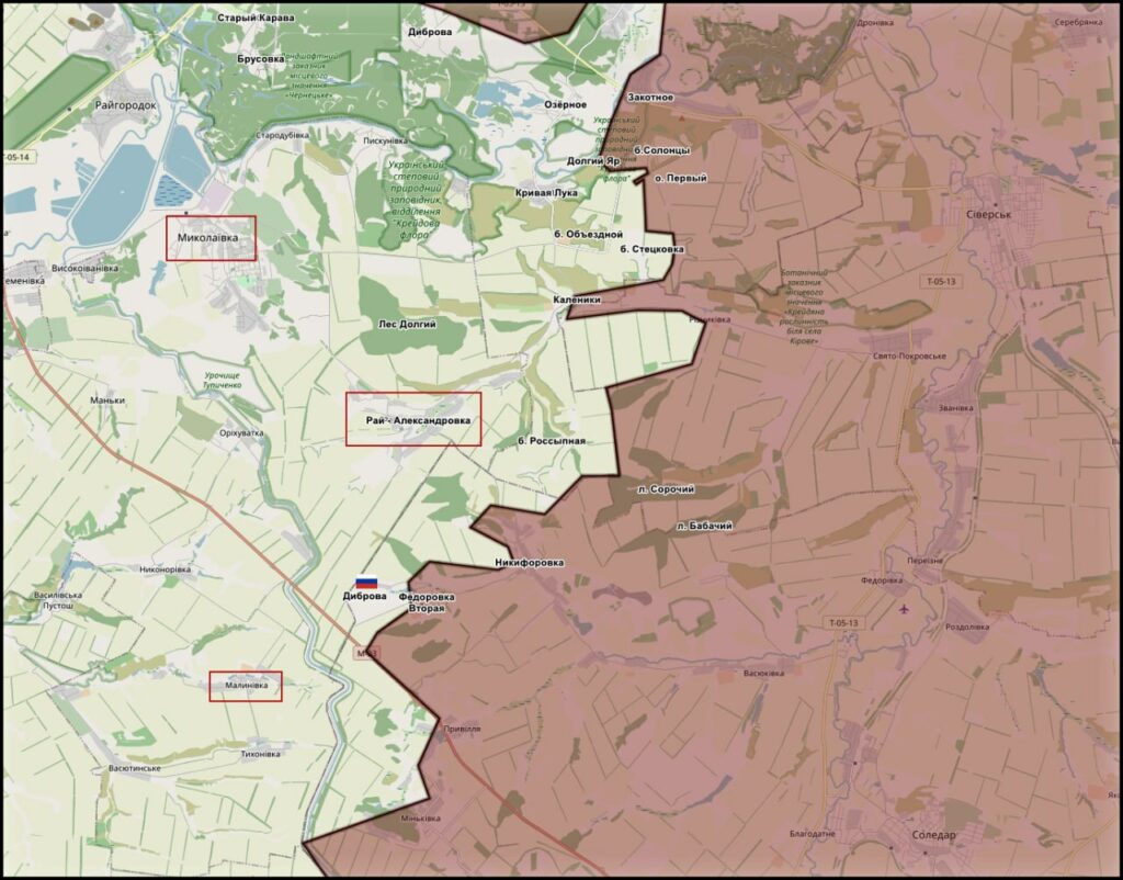 Фиксируется продвижение ВС РФ в районах Фёдоровки-2 и Дибровы у трассы М-03. Минобороны России заявило об освобождении Дибровы. Общая динамика указывает на расширение зоны контроля и усиление давления вдоль дорожной сети и в направлении канала Северский Донец-Донбасс.