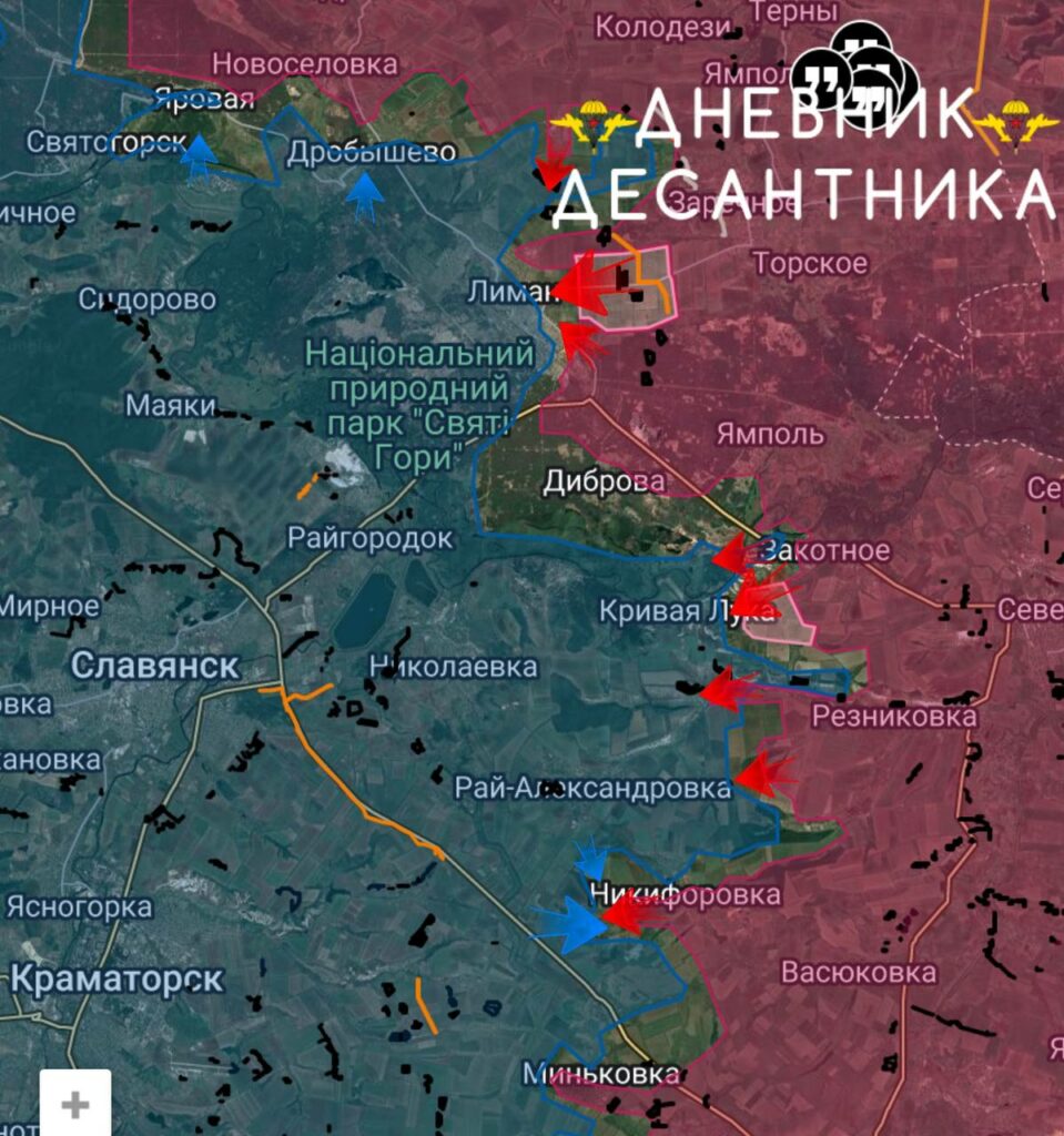 Участок Резниковки: Бои идут в западной части Резниковки, где еще присутствуют локально вражеские группы, также в восточных частях Кривой Луки и Калениках. Чуть южнее гвардейцы 123-ей бригады продвигаются к Рай-Александровки, где уже есть определенные успехи лесных массивах. В Федорвке-2 идут ожесточенные бои, ВСУ пытаюся зайти от Липовки в Никифоровку и от Диброва в Федоровку-2, тем самым вражеские войска пытаются не допустить наше продвижение к Славянску, — Дневник Десантника.