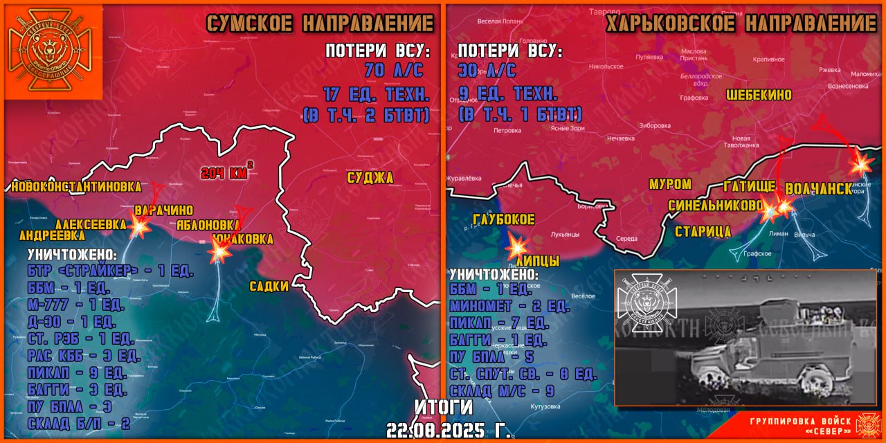 На Липцовском участке фронта без существенных изменений. Расчеты FPV Северян выявляли огневые точки 13 брон НГУ и наносили огневое поражение. На участке фронта Меловое-Хатнее продолжается продвижение Северян в направлении Хатнее. За сутки наши бойцы продвинулись на 600 м. и заняли две позиции ВСУ. Отмечается отсутствие на ЛБС подразделений 92 ошбр и 82 одшбр. Их позиции заняла тероборона. Учитывая тот факт, что еще одна бригада, претендующая на статус «элитной» 47 омбр также выведена в тыл, вероятнее всего после доукомплектования ВСУ могут готовить новый прорыв фронта силами этих трех бригад, — Северный Ветер.