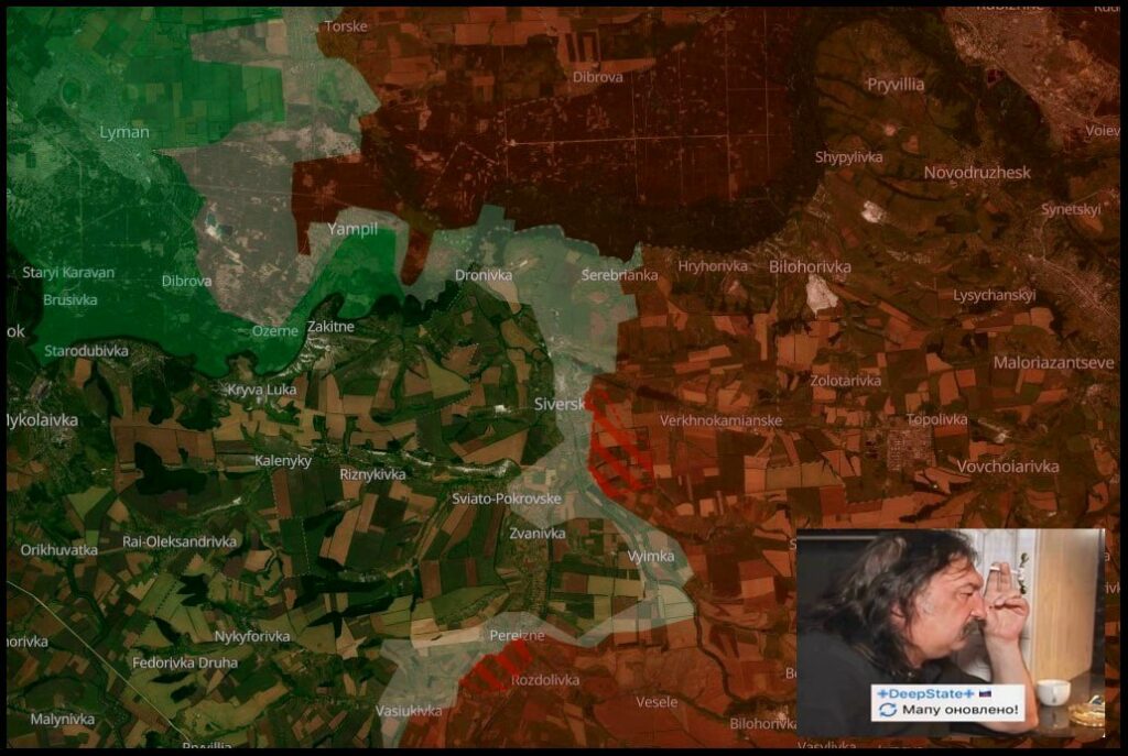 Общая ситуация: Ямполь полностью перешёл под контроль ВС РФ. Есть успехи в районе Закотного. Прорвали оборону противника на востоке Северска, теперь наступательные действия усилились и с этой стороны. Продвигаемся в Кирово (Свято-Покровском).