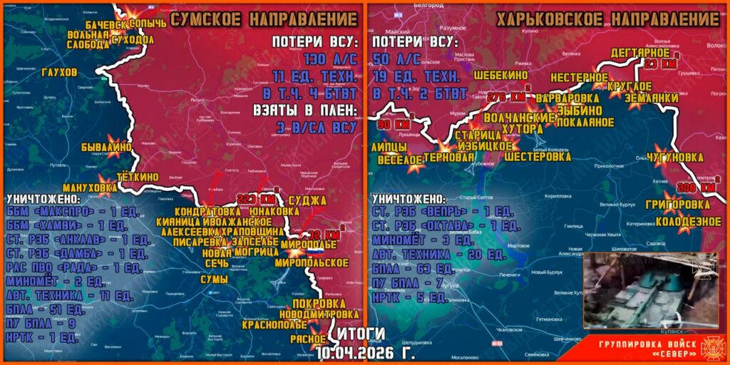 В Сумском приграничье МО РФ сообщило об освобождении пос. Миропольское. В ходе боёв было уничтожено подкрепление ВСУ из Великого Прикола. На остальных участках направления — позиционные бои без существенных изменений. Штурмовики ГВ «Север» продолжают вести ожесточенные бои, продвигаясь вглубь Сумской области. Наши войска нанесли удары по скоплениям живой силы и техники противника в районах Бывалино, Писаревки, Кияницы, Могрицы, Бачевска, Суходола, Новодмитровки, Краснополья и села Новая Сечь.