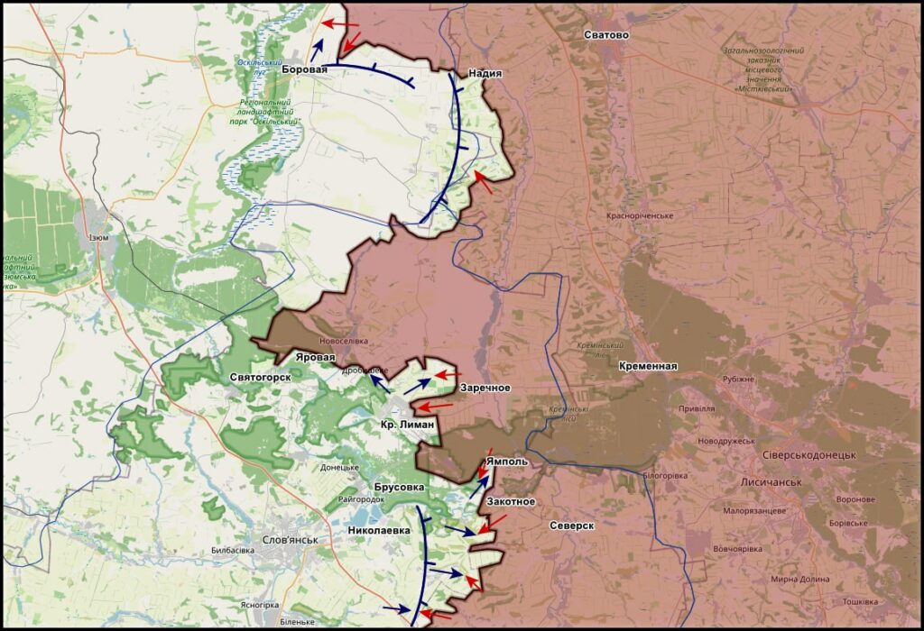 На Краснолиманском направлении идут бои в городской черте. В Дробышево, Святогорске противник использует ДРГ для контратак, что сильно замедляет продвижение наших войск. ВС РФ продвинулись по трассе Заречное — Красный Лиман, зачистили важные опорные пункты и рвы противника, вплотную подошли широким фронтом к Красному Лиману. Противник, в свою очередь, наносит удары: местность открытая, постоянно работают БПЛА.